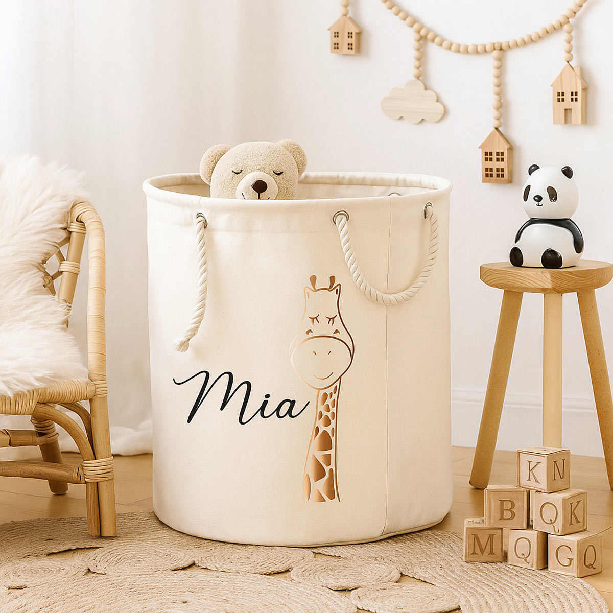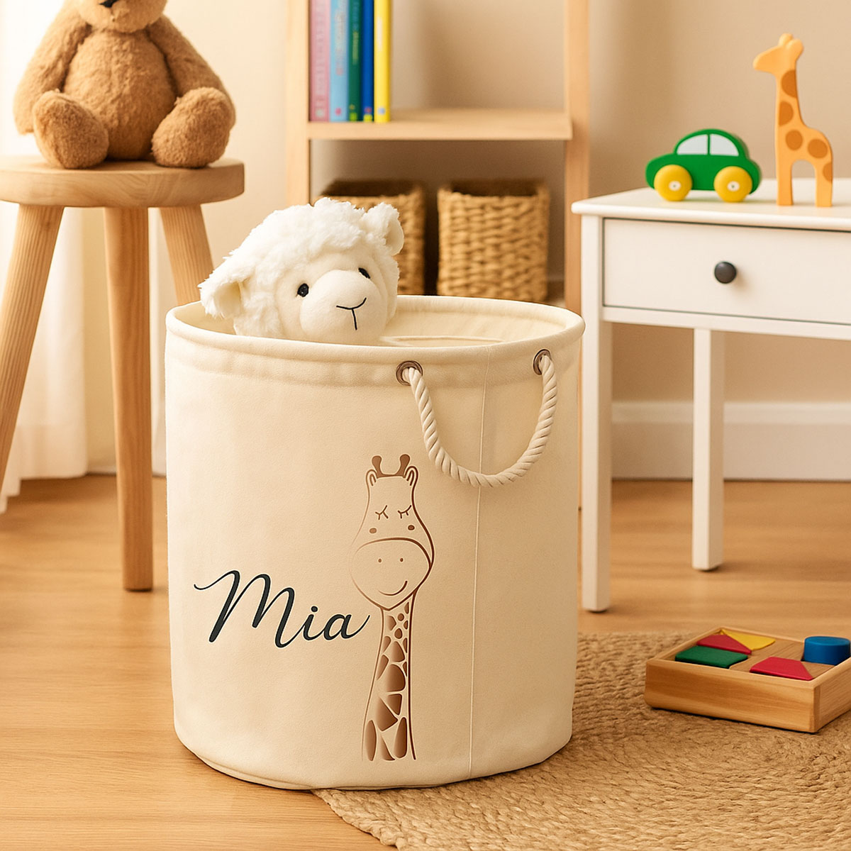 Perfekt als Geschenk für Eltern oder zur Gestaltung des eigenen Kinderzimmers – dieser personalisierte Aufbewahrungskorb mit Giraffenmotiv vereint praktischen Nutzen und liebevolles Design!