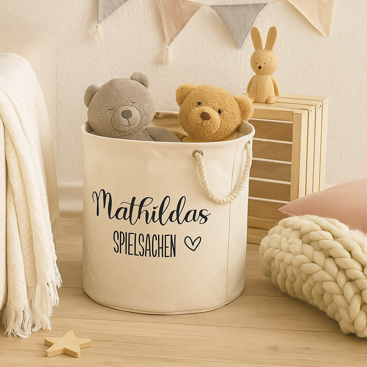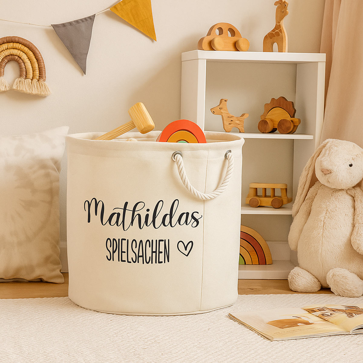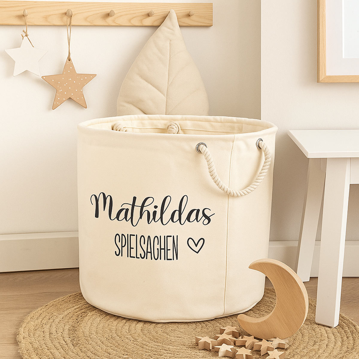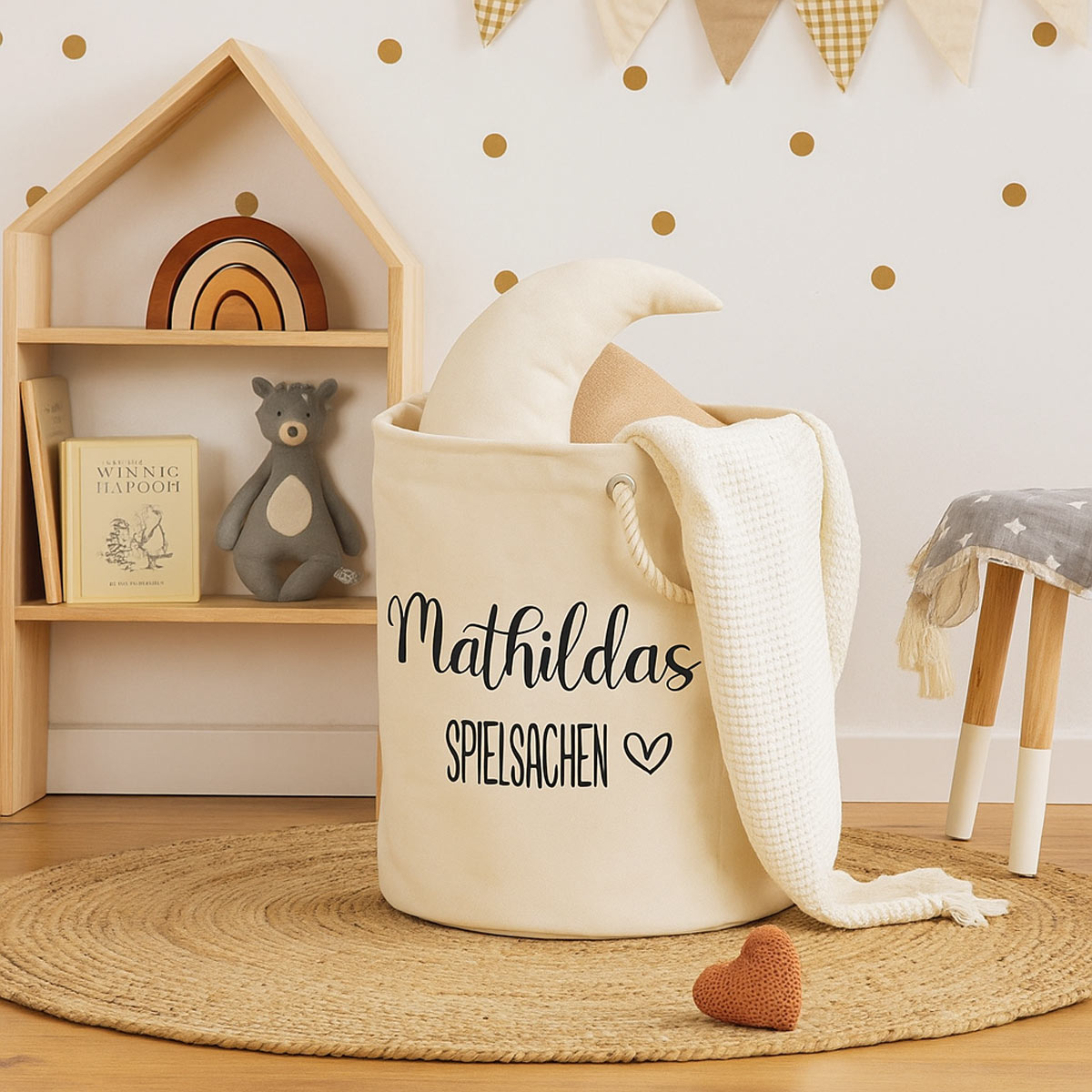 Der entzückende Ordnungshelfer mit Kindernamen und kleinem Herz ist perfekt zur Aufbewahrung und Dekoration für das Kinderzimmer. Ideal zum Verstauen von Kuscheltieren, Lieblingsbücher, Kissen, Kuscheldecken oder Spielsachen.
