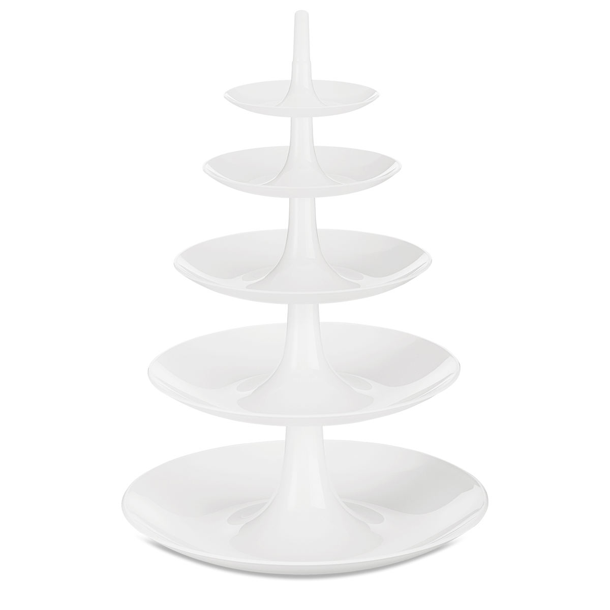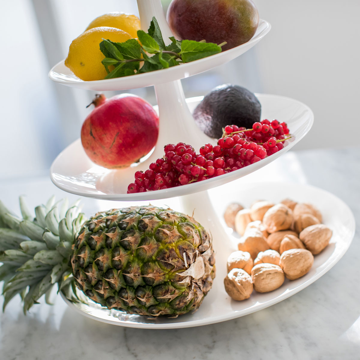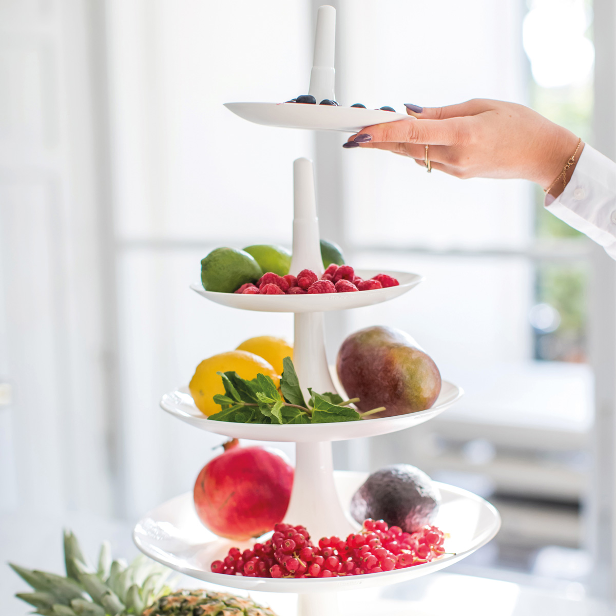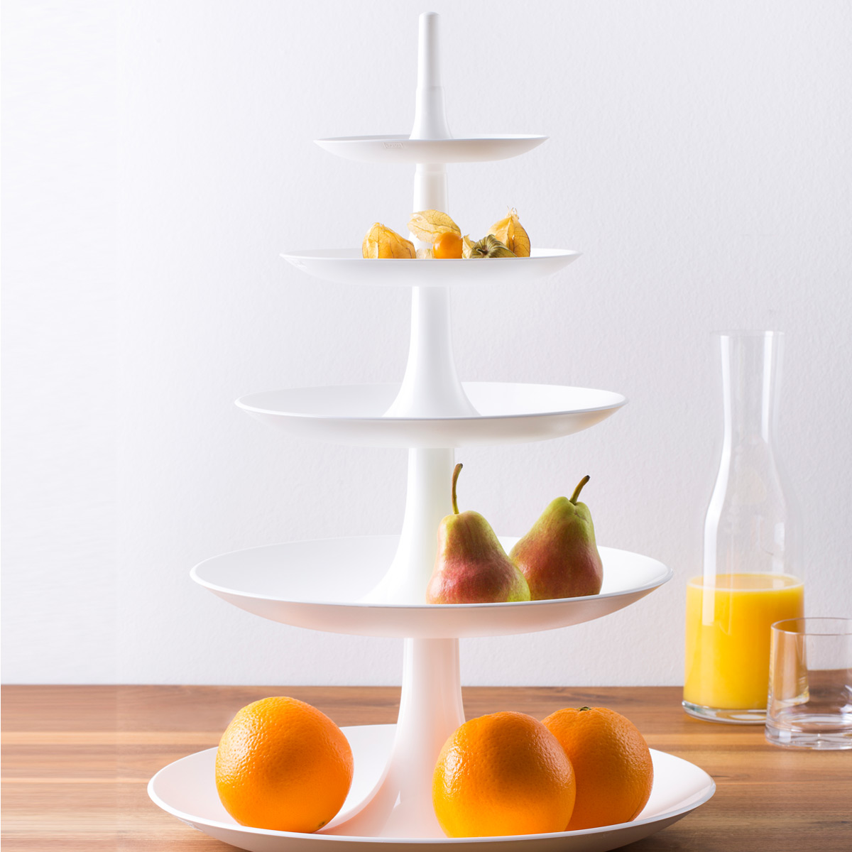 Ihre Ausmaße sind so einladend ausladend, dass die untere Ebene sogar Melonen und Ananas aufnehmen kann. Auf den kleineren Schalen darf sich dann allerlei Leckeres von Apfel- bis Beeren- und Gummibärengröße tummeln. Zur Aufbewahrung kann BABELL BIG wie alle ihre Schwestern in ihre Elemente zerlegt und in gespiegelter Reihenfolge kompakt zusammengesteckt werden. Die stabilen Etagen sind lose aufeinander gesteckt und können daher auch einzeln verwendet werden.