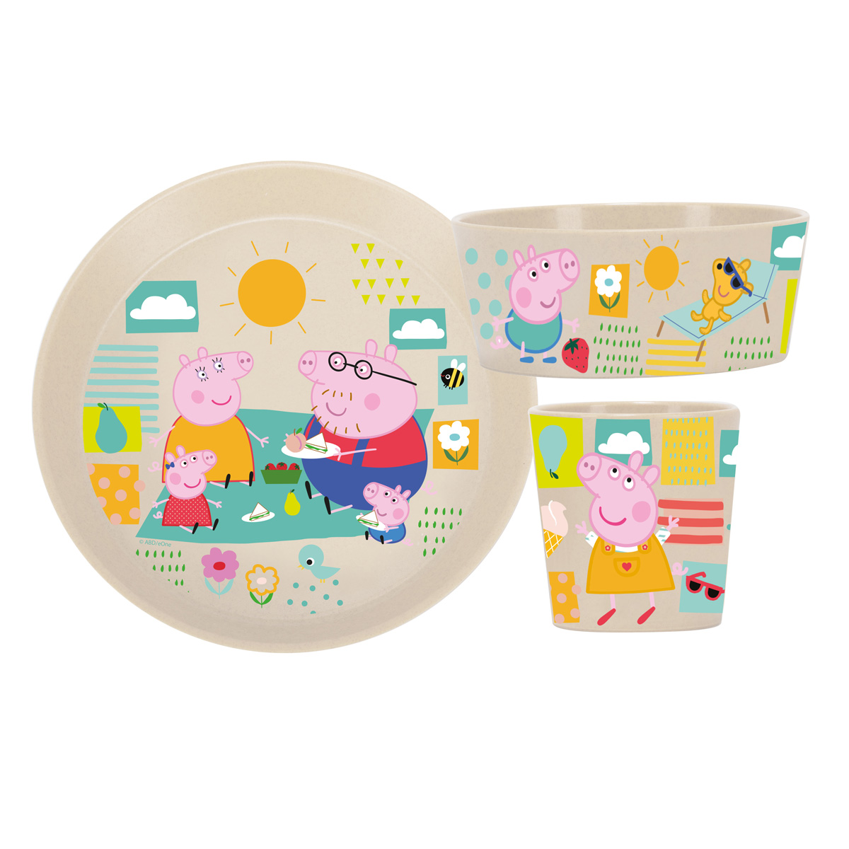 Der kleine Teller ist ideal für Obst und gesunde Snacks und die kleine Schale macht sich für Müsli oder kleine Gerichte schnell unentbehrlich. Der kompakte Becher lässt sich von kleinen Händen gut greifen und kommt gänzlich ohne Henkel aus. Das Geschirrset CONNECT PEPPA PIG ist robust, leicht und stapelbar und verzeiht auch mehrfache Saltos vom Esstisch. Ein wahres Multitalent für jeden Tag.