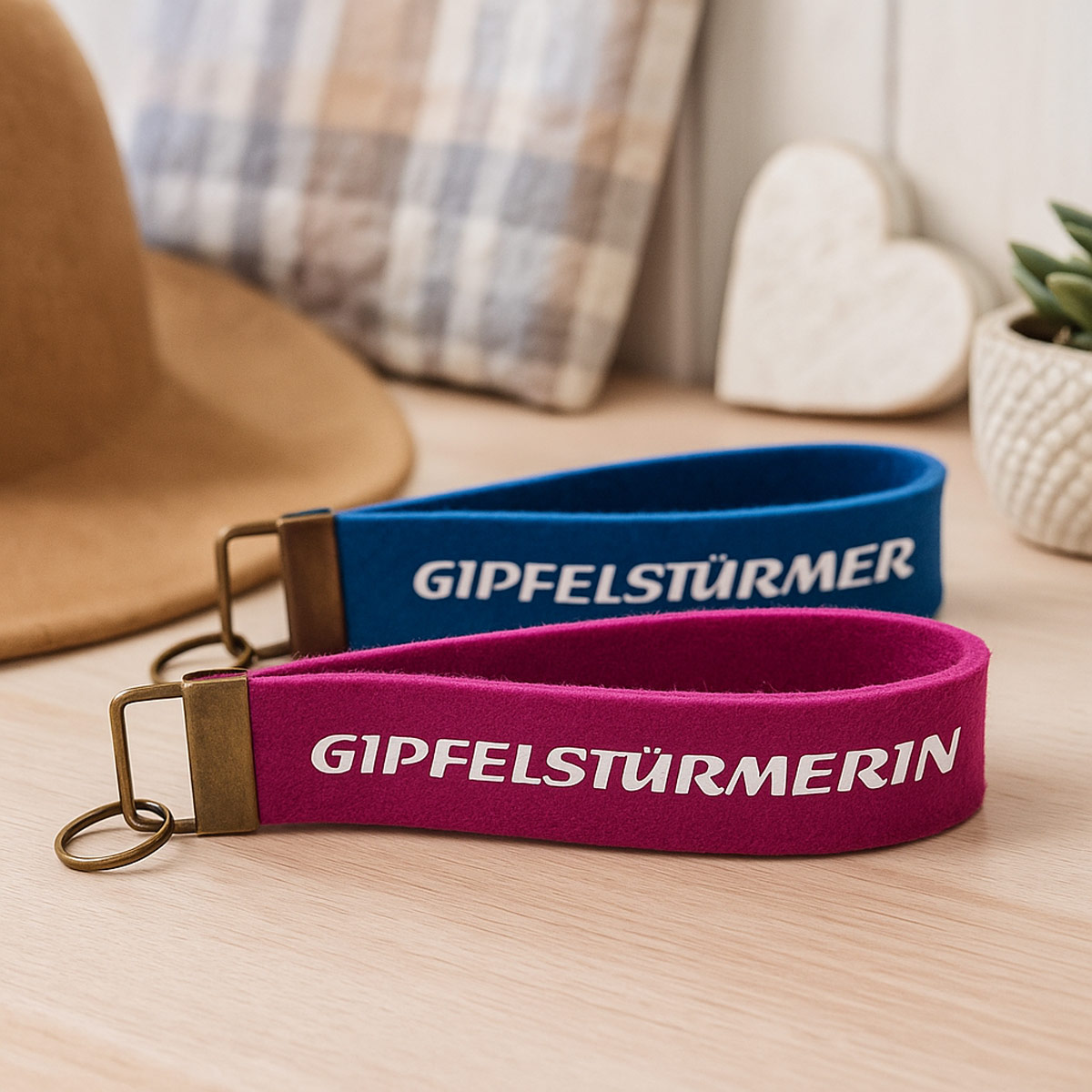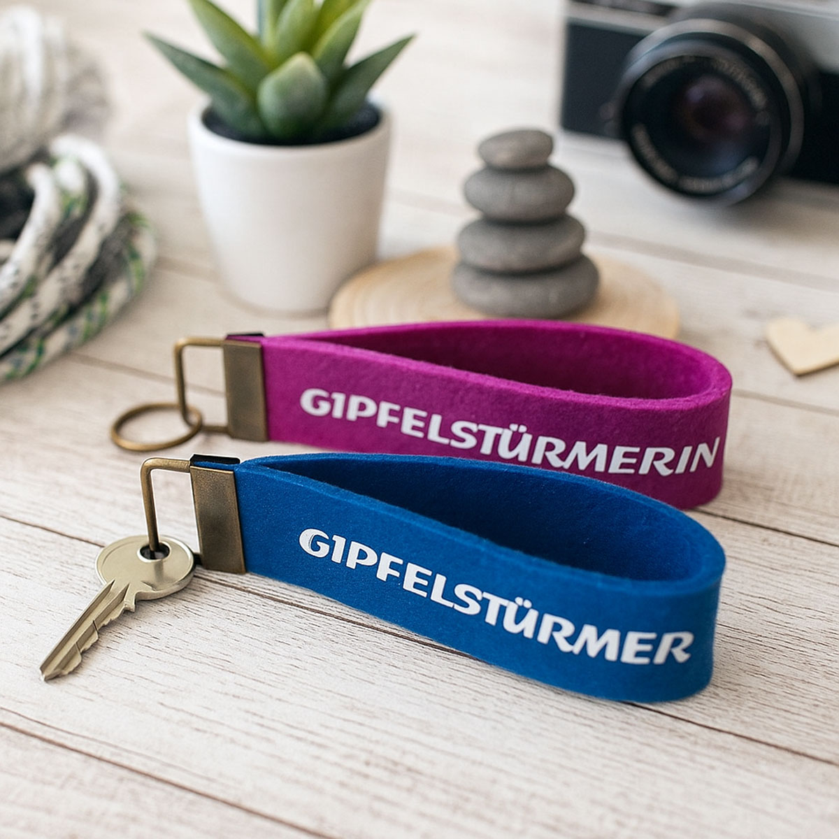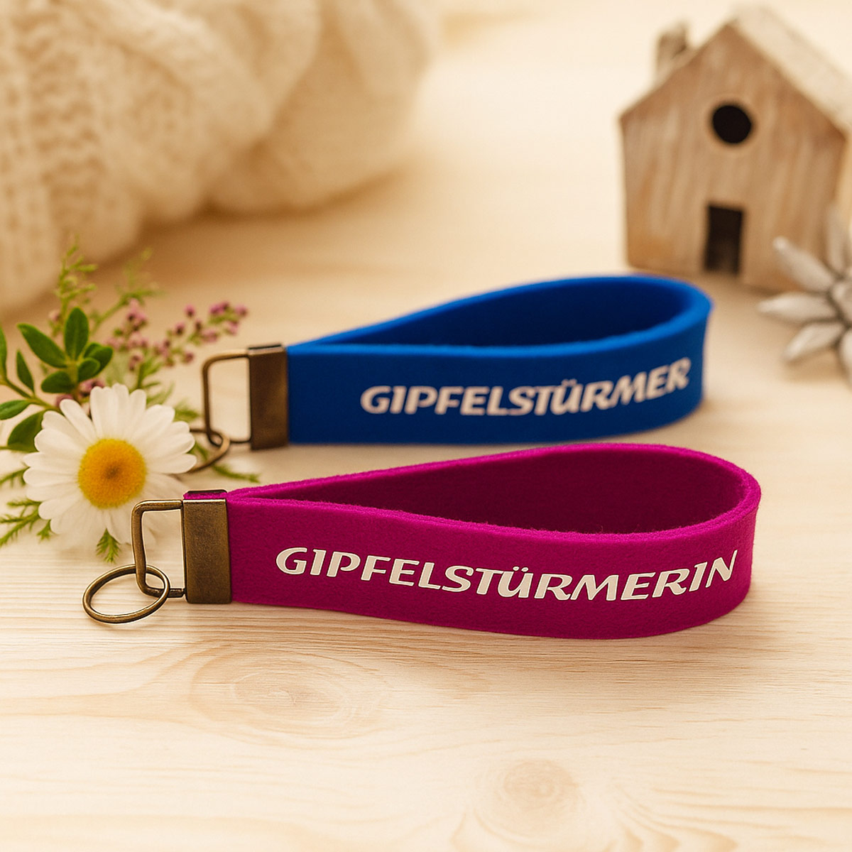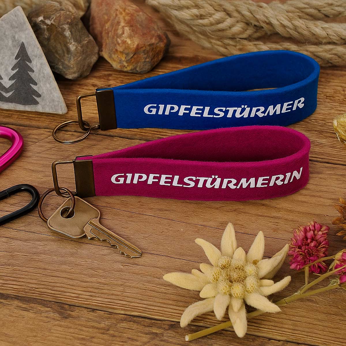 Jedes Set besteht aus zwei Filzanhängern in Pink und Blau, mit weißem Flexdruck "Gipfelstürmer" & "Gipfelstürmerin". Die Kombination aus feinem Naturwollfilz und einer Bügelklemme mit Schlüsselring in Altmessing-Optik sorgt für Langlebigkeit und einen natürlichen Look.
