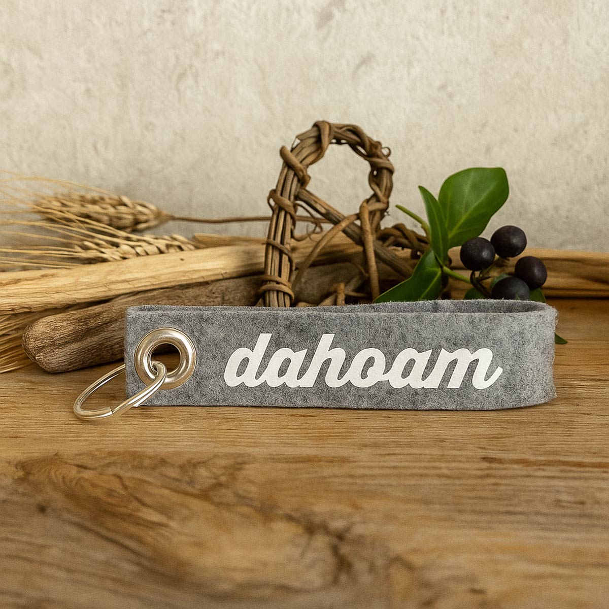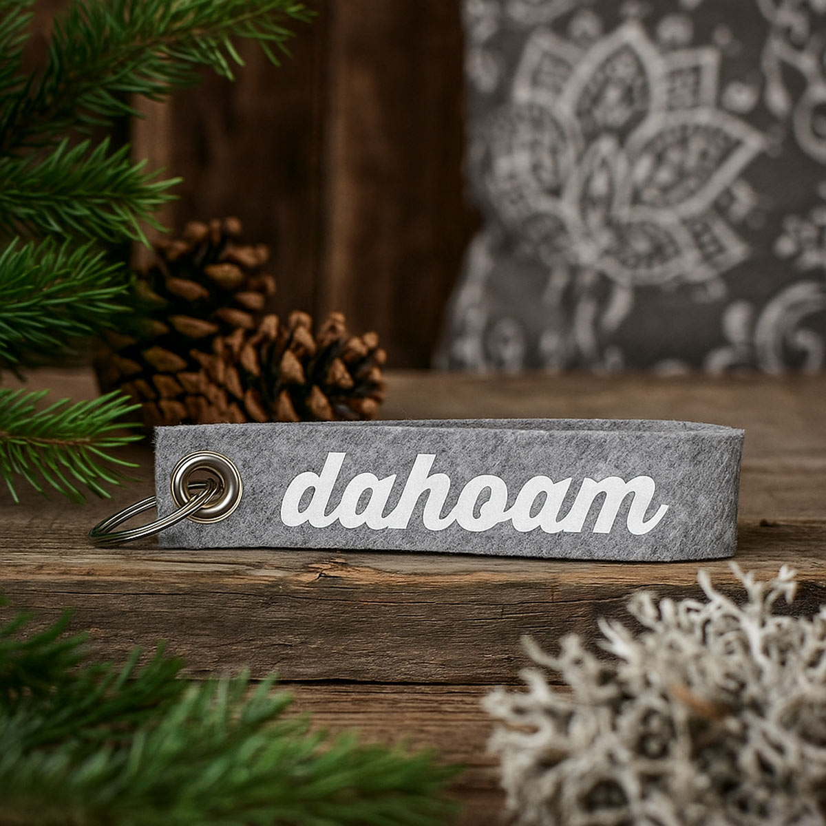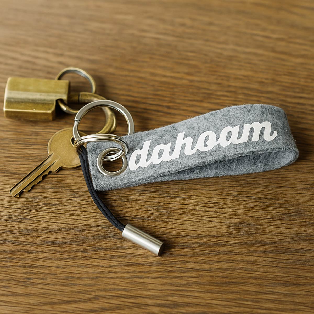 Die grau melierte Filzschlaufe mit weißem Aufdruck 'dahoam' ist schlicht, modern und zeitlos. Der Schriftzug besteht aus matter, reflektionsfreier Flexfolie (zertifiziert nach Öko-Tex Standard 100). Die silberfarbene Öse mit stabilem Schlüsselring sorgt für sicheren Halt und eine hochwertige Optik.