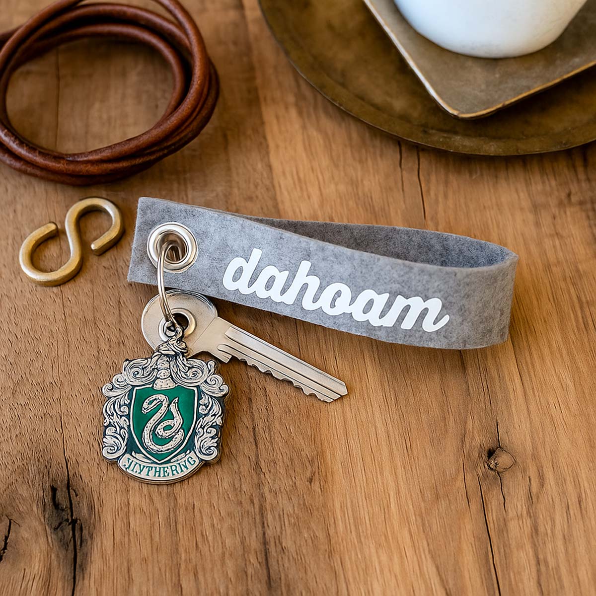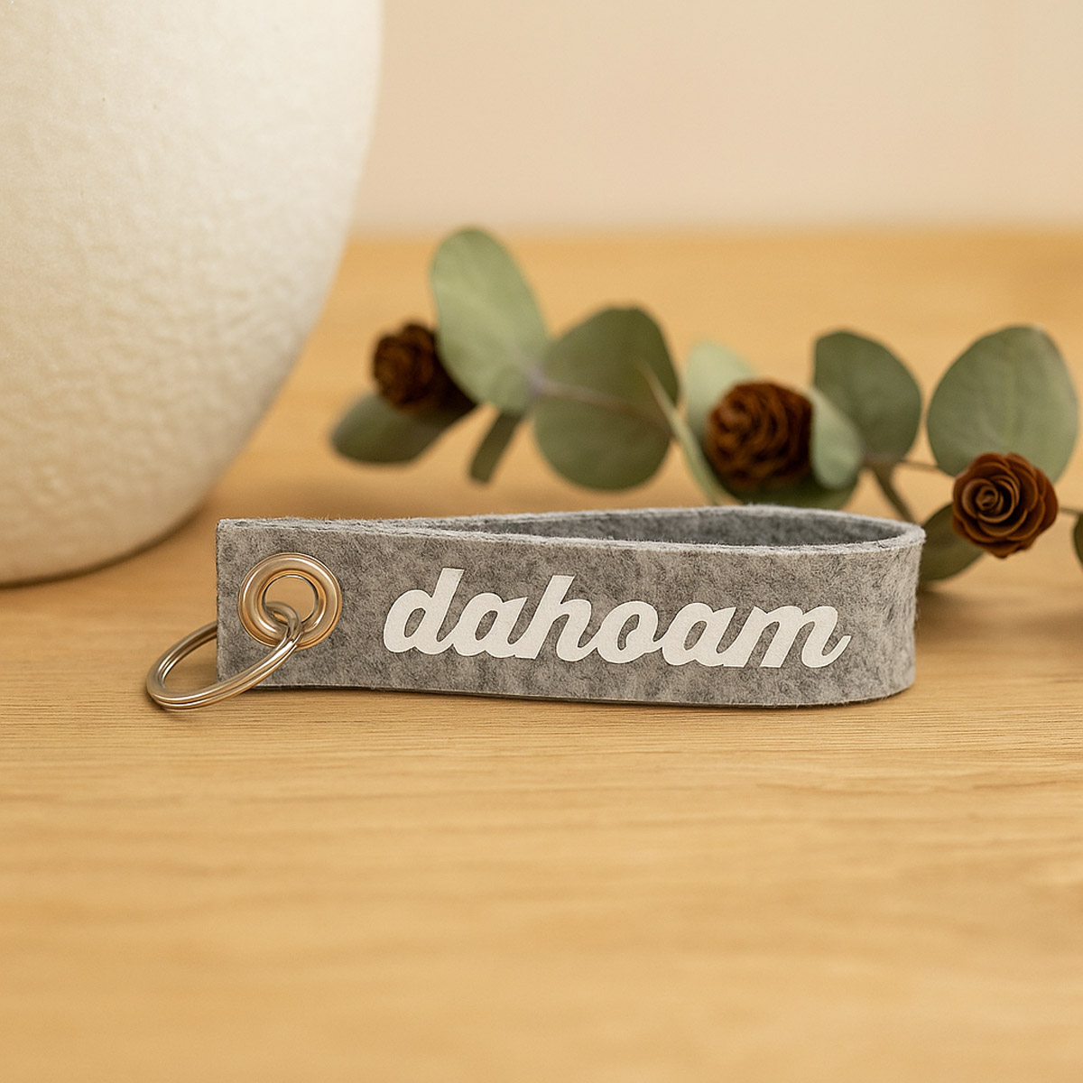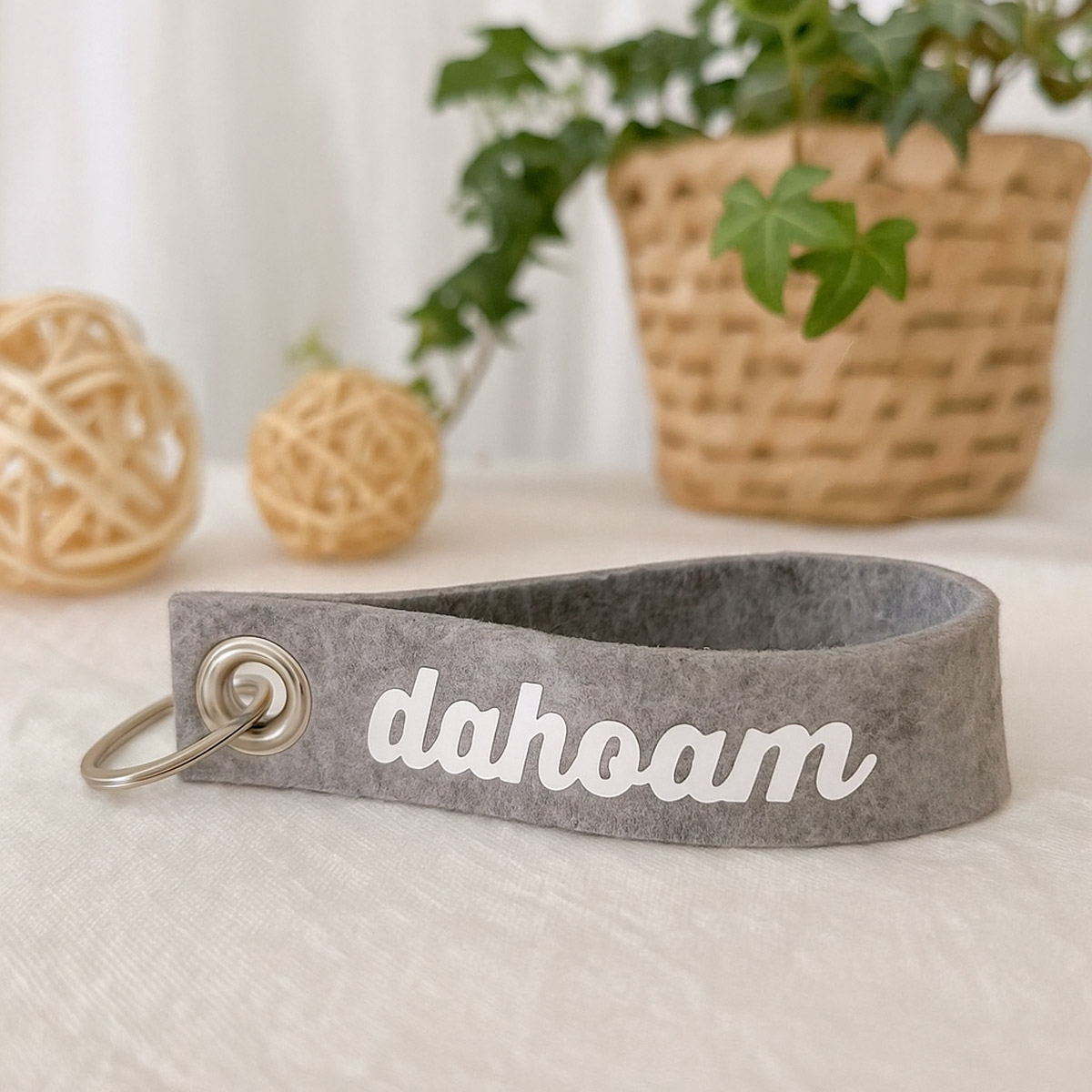 Die grau melierte Filzschlaufe mit weißem Aufdruck 'dahoam' ist schlicht, modern und zeitlos. Der Schriftzug besteht aus matter, reflektionsfreier Flexfolie (zertifiziert nach Öko-Tex Standard 100). Die silberfarbene Öse mit stabilem Schlüsselring sorgt für sicheren Halt und eine hochwertige Optik.