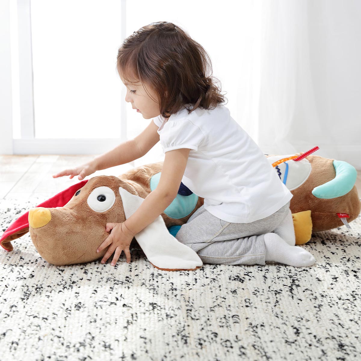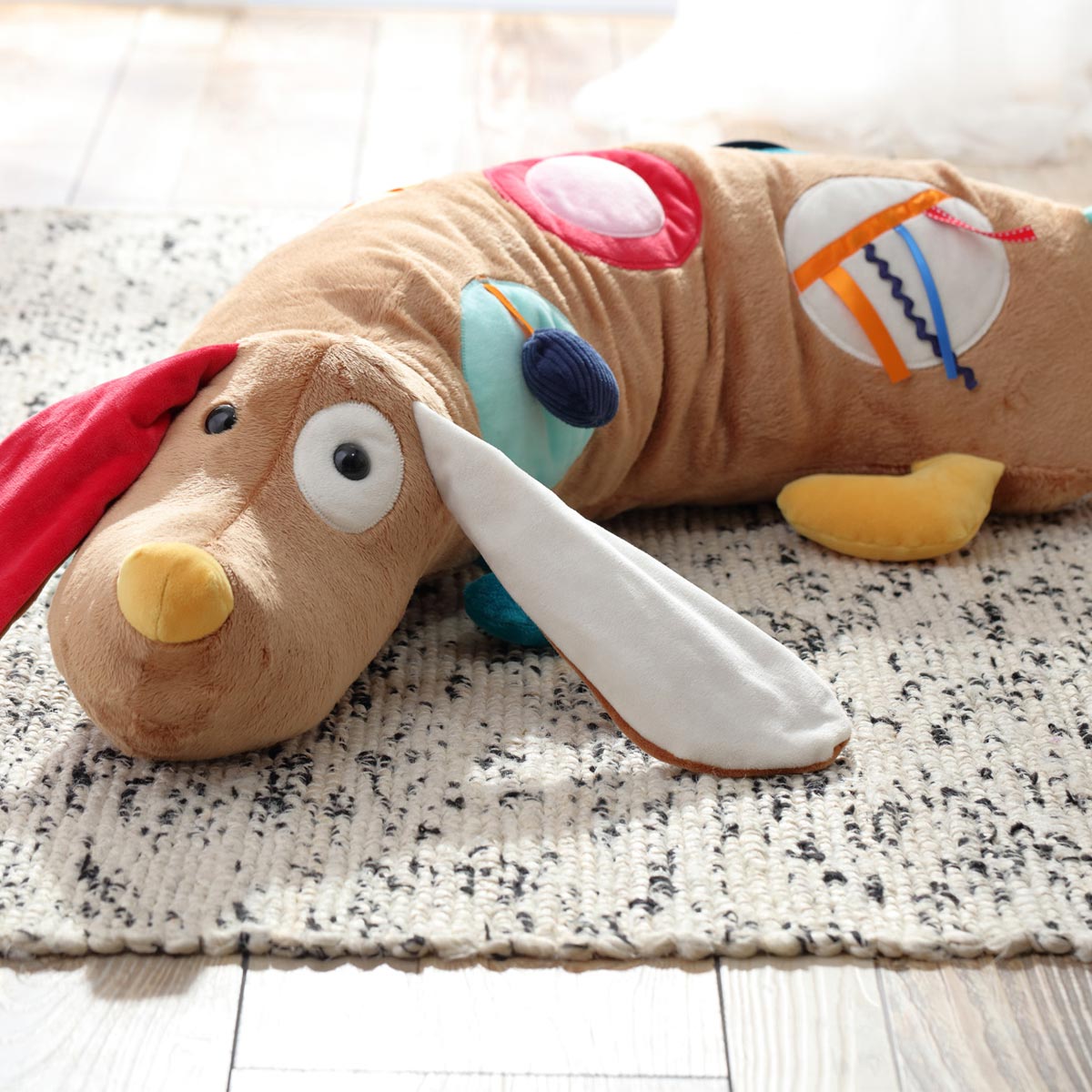 Ein Hund für alle Fälle - zum Drauflegen, Abstützen und Entdecken. Das große Spiel- und Kuschelkissen begleitet Kinder viele Jahre. Babys im Krabbelalter erforschen mit allen Sinnen die haptischen und akustischen Elemente: Knisterfolie in den Ohren, Rassel im Ball, Quietsch im Körper. Bei größeren Kindern ist der lustige Gefährte als Kuschelkissen in der Leseecke oder als Seitenschläferkissen im Bett gefragt. Das sigikid-Programm PlayQ Baby Learning unterstützt mit seinen textilen Aktivspielzeugen verschiedene Entwicklungsstufen in den ersten 12 Monaten.