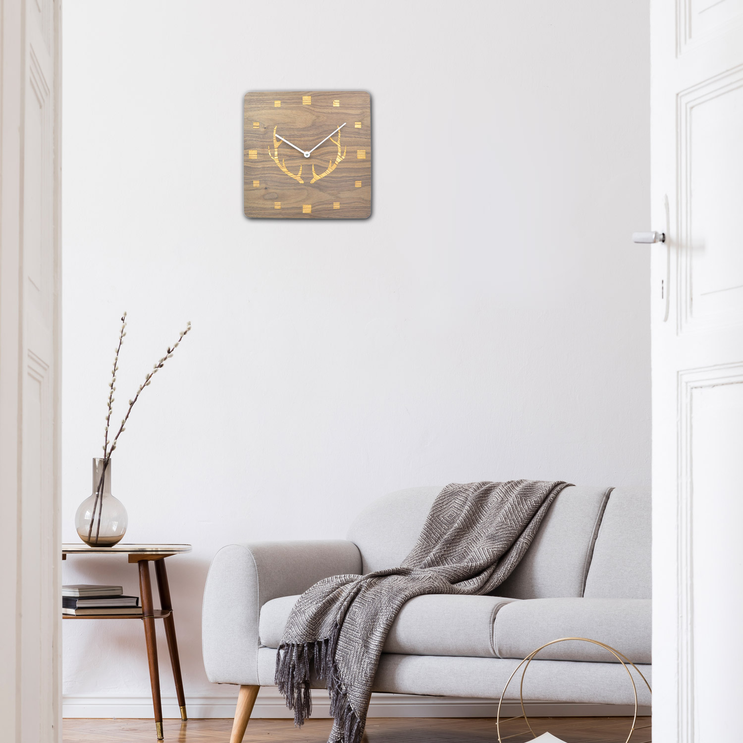 Wanduhr aus Holz mit Hirschgeweih